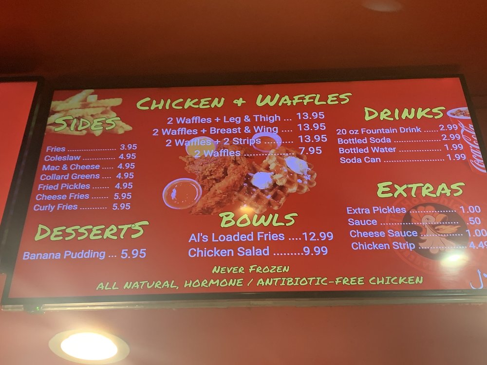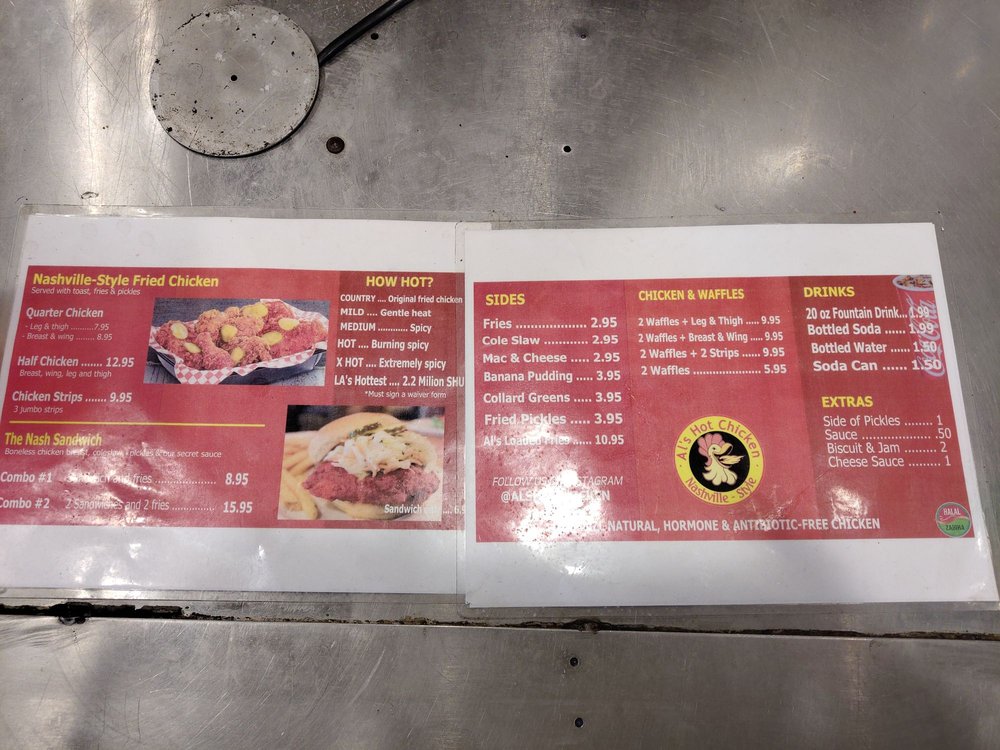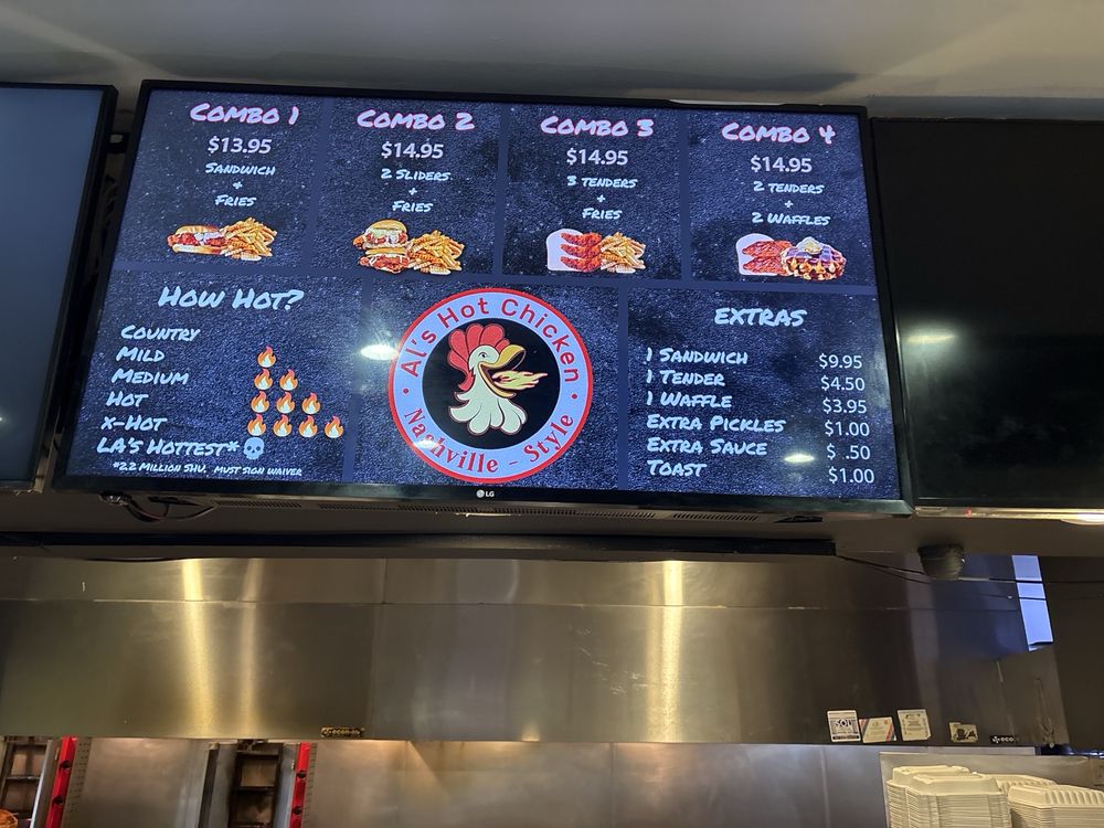 “ There's no denying the fried chicken craze is everywhere lately, with new spots popping up left and right. But let me tell you, nothing compares to Al's. Their chicken stands out for its size, juiciness, and perfect crispiness. The signature seasoning? Absolutely unmatched. Unlike other places that drown their flavorless chicken in sauce, Al's Hot Chicken doesn't need to rely on that trick. I'm thrilled to see more locations opening up, and you can bet I'll be stopping by the next time I'm in the area. I love that they offer more than just hot chicken sandwiches and tenders, with a great variety of sauces to choose from too. While there weren't many employees at this particular location, the one at the front counter was extremely friendly and helpful. It was my first time there, so I asked for a couple of recommendations, and they did not disappoint. I went with combo number three, which came with tenders and fries. The chicken was incredibly juicy, with or without sauce, and you could really taste the care they put into it. They definitely know what they're doing in the kitchen. I also tried the macaroni and cheese, and it was incredibly creamy with the pasta cooked perfectly to al dente. It was a nice complement to the meal and added to the overall experience. I do wish the menu had more kid-friendly items or options for vegetarians, but overall, I had a fantastic experience and will definitely be back. The restaurant was clean and well-organized. While there isn't a ton of seating, and it can get crowded, as long as you go at a decent time, you should be fine. ”