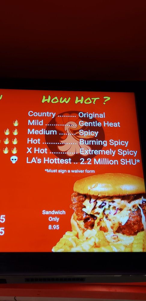 “ Best hot chicken place in LA by far! Had the sandwich (spicy level medium) and tenders (spicy level hot) with fries for take out. Loved the spicy level on the sandwich, it was the perfect kick! Tenders were at a best spicy for anyone who wants to be chugging water in a good way-- make sure to get the white sauce. It was super good with the chicken! ”